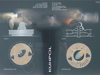 Eine rotierende Milchkanne, schwebend, beherbergt den Grossteil der gewünschten Funktionen. Ihr schwebender Zustand gibt Gelegenheit bodenständig über einen zentralen großen Raum das Gebäude zu betreten. Im Zentrum jedoch steht der Mensch. Er ist das Maß der Dinge um Ihn dreht sich alles. Über Ihn erschließt sich der Sinn des Kuhpoles als auch das Gebäude. Zentrum wird sichtbar über Fliehkraft, Dynamik vermittelt das hier eine Momentaufnahme zwischen Vergangenheit und Zukunft sichtbar gemacht werden soll. Das eine wird bewahrt, archiviert, das andere wird innovativ angegangen.